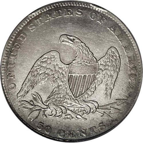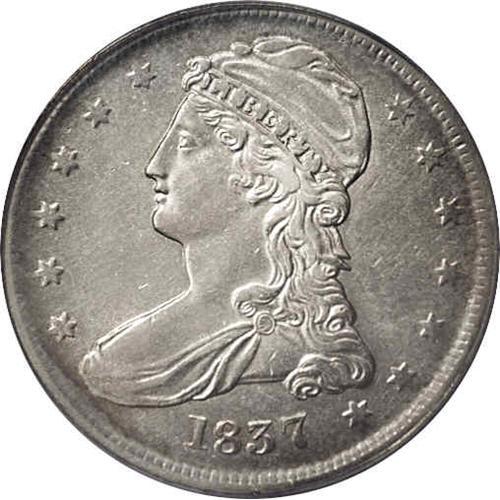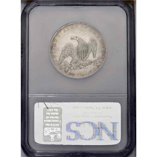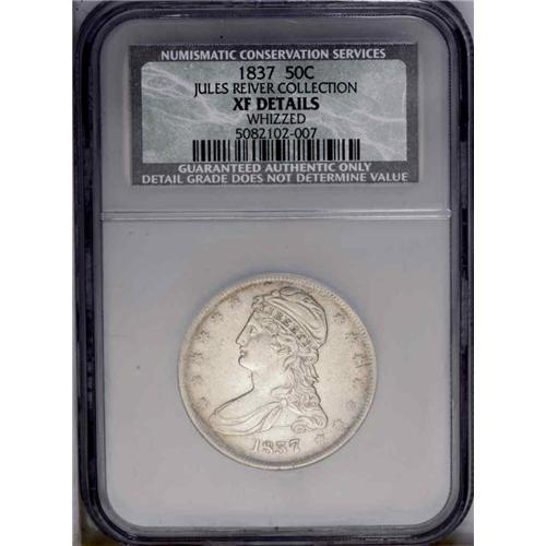 <B>1837<50C>--Whizzed--NCS. XF Details.</B></I> JR-27, R.8. Clash marks cause lumps in front of lips, and three engravers' scratches are down to the right between D and S, touching both. Silvery surfaces are unnaturally bright and moderately hairlined. Hints of light brown gravitate to the peripheries. Envelope Included.