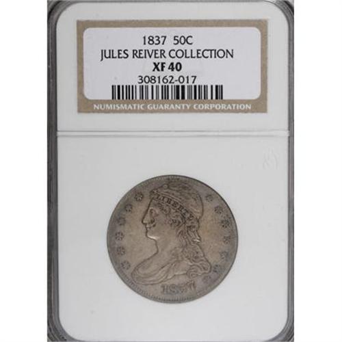 <B>1837 50C XF40 NGC.</B></I> Ex:Jules Reiver Collection. NGC Census: (35/834). PCGS Population (66/815). Mintage: 3,629,820. Numismedia Wsl. Price for NGC/PCGS coin in XF40: $155. (#6176)<BR><BR><B>Coin Engraver:</B> Christian Gobrecht<BR><BR><b>Shipping:</b> Coins & Currency (<a target="_blank" href="http://www.heritageauctions.com/common/shipping.php">view shipping information</a>)