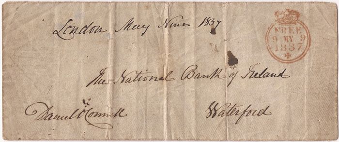 Envelope dated "London May Nine 1837" addressed to "The National Bank of Ireland Waterford" and signed lower left all in the hand of Daniel O'Connell. With Royal Free Frank marking and stamped on reverse at Waterford 11 May 1837.