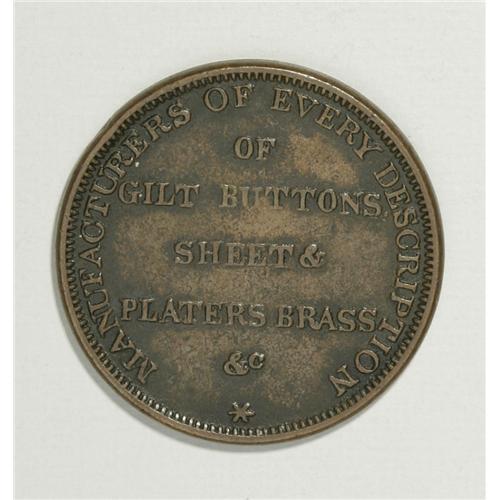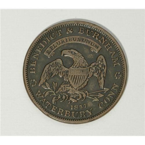 <B>1837 Benedict & Burnham, Waterbury, CT, XF45 Corroded Uncertified.</B></I> Low-109, HT-104, R.3. A bold but mildly granular example that has maroon devices and chestnut and mahogany fields. The eagle's shield has a tiny dig.<BR><BR><b>Shipping:</b> Coins & Currency (<a target="_blank" href="http://www.heritageauctions.com/common/shipping.php">view shipping information</a>)