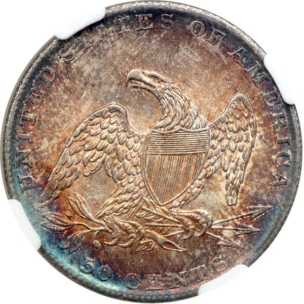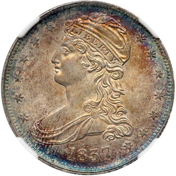 1837 Capped Bust Half Dollar. NGC graded MS-64. Lovely golden and electric blue iridescent toning on both sides. Highly lustrous with the shimmering satin luster this revised Capped Bust half dollar coinage of 1837-39 is so well known for. The half dollars starting with 1836 (Reeded Edge) were struck on the new steam press at the mint using revised designs and a close (as opposed to open) collar die. A collar die, acting as a third die, imparts the milling on the edge at the moment the coin is struck. A great selection for numismatist who needs this short-lived type.