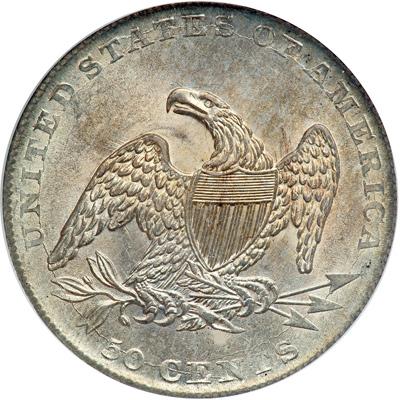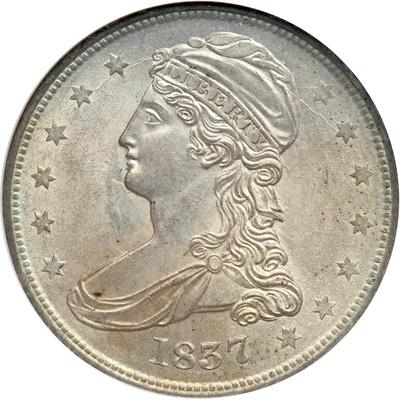 1837 Capped Bust Half Dollar. NGC graded MS-64. A lovely frosty mint example with delicate light toning. A satiny coin with lovely soft silver-gray underlying luster that bolsters the beauty of the sharp designs. All this is perhaps obvious from the photos. What we need to emphasize also is that the central strike is customarily crisp and detailed for the issue with the usual sharp metal flows into the deepest recesses of the dies on both sides. The stars are flat, however, the usual indication of uneven strike at the margins. Pop 93; 41 in 65, 8 in 66, 3 in 67.