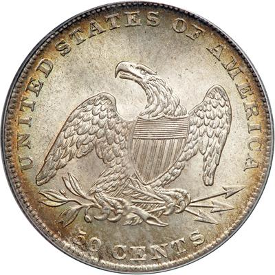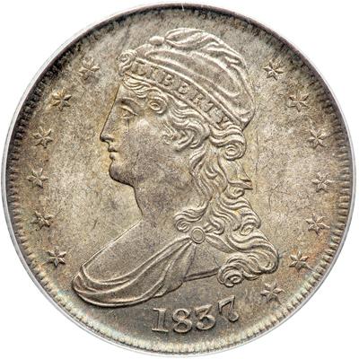 1837 Capped Bust Half Dollar. PCGS graded MS-65. Old green holder. Nice even toning. This is a noteworthy example of a new design struck using brand-new (to the U.S. Mint) technology: a steam-operated minting press. Not only is the coin distinctive looking, with spiffy newly worked Capped Bust profile of Liberty, but the coin excels as one whose lightly patinated surfaces show pinpoint striking definition throughout and are largely free of distracting contact marks. A sharp impression was left by the recoil of the dies that struck this 1837 half dollar. We will be impressed to see how bidders react. The Gem MS65 level is the turning point to these elusive pieces! Pop 17; 7 finer; 5 in 66; 2 in 67. (PCGS # 6176).