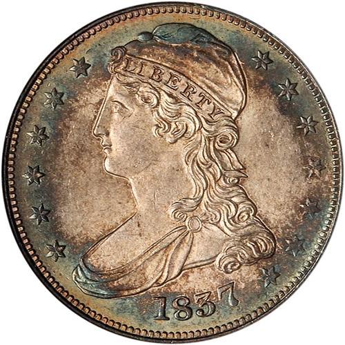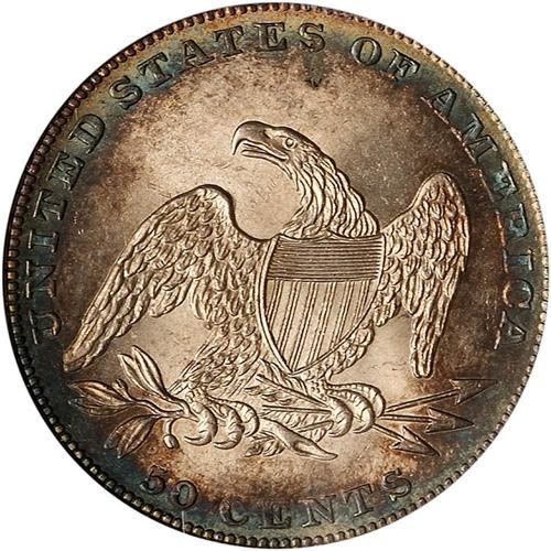 A fully struck exceptionally choice example of a rare reeded edge half, a two year type coin with 50 Cents on the reverse. The obverse light golden and rose grey with a hint of blue with a single hairline in front of the face, the reverse the same only the color is several shades lighter and a light bag mark under the arrows. One of only thirty in equal grade, and only ten are currently certified finer. All six that have sold in the past five years have brought between $16,000 and $25,000.