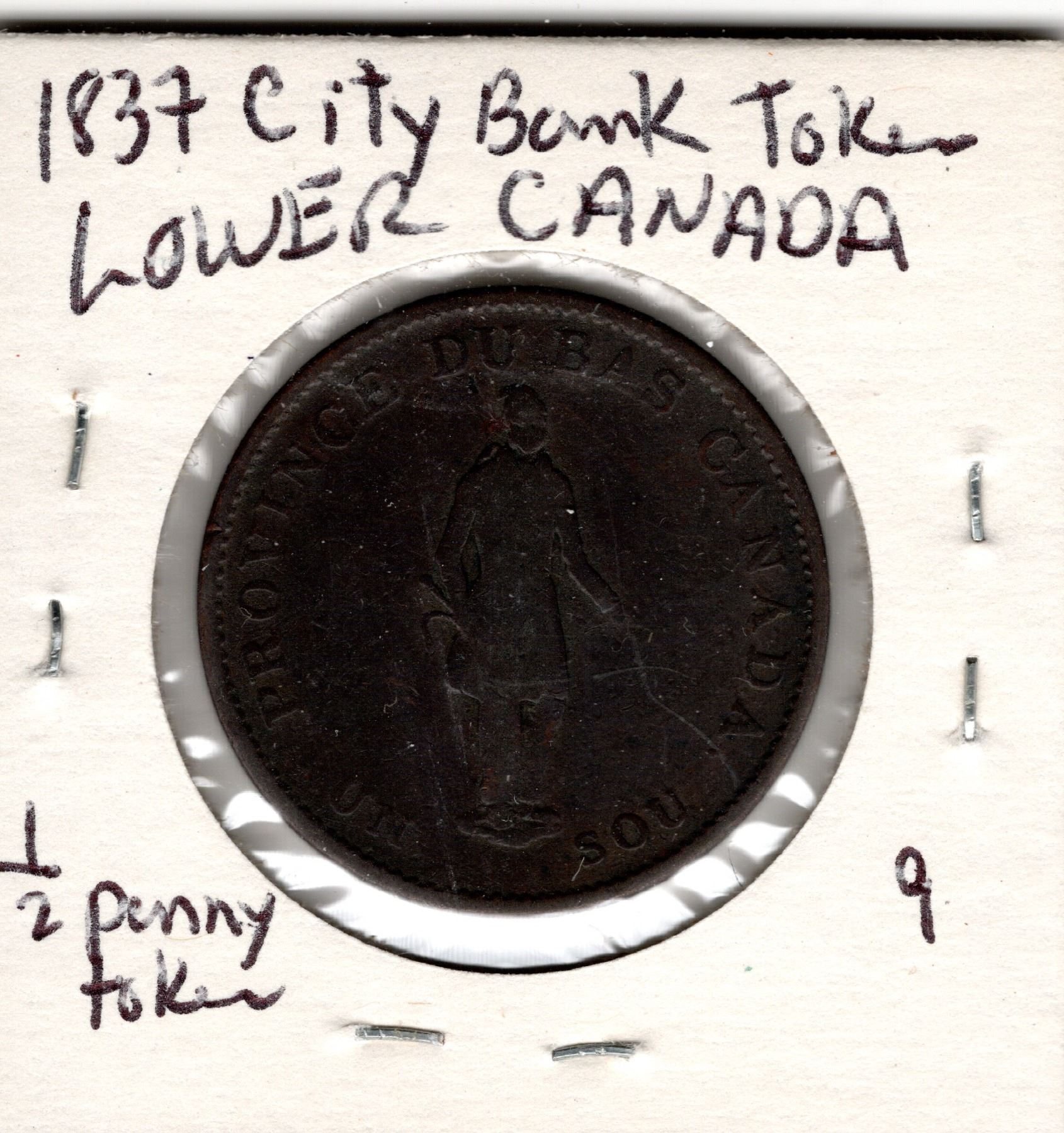 1837, CITY BANK TOKEN, LOWER CANADA, HALF PENNY
