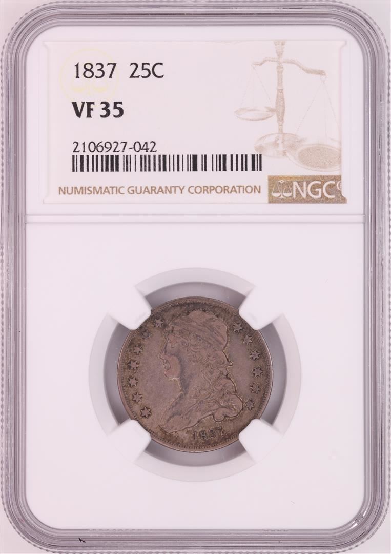 One 1837 Capped Bust Quarter Coin NGC VF35. NGC Certified.