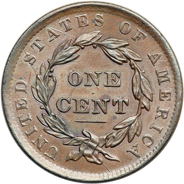 1837 Coronet Head Cent. PCGS graded MS-63 Brown. Frosty light steel brown with splashes of darker steel and chocolate brown toning on the obverse. No marks or other defects. The surfaces are satiny and free of any wear or friction, but the uneven obverse toning is a slight distraction to the otherwise excellent eye appeal. MDS+. Slightly later than the preceding example. The flowlines and reverse die cracks are stronger, but the line left of the upright of the 1 remains complete and the dash right of the base of that 1 is weak but visible. The die clashmarks are still visible on both sides. Called MS60 net AU50 in the Noyes census, his photo #32112. Our grade is AU58. Pop 1; 1 in 65 BN; 1 in 66 RB. Only 3 graded at PCGS for the variety. DWH #3323 (PCGS # 37138) .
