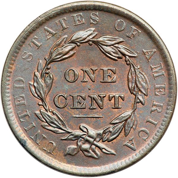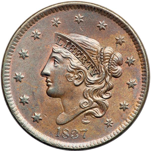 1837 Coronet Head Cent. PCGS graded MS-63 Brown. Lustrous light bluish steel brown with slightly lighter brown toning on the lower right half of the obverse. Traces of slightly faded mint red show on the obverse while about 10% of the mint color remains visible on the reverse. The only marks are some very tiny vertical nicks in the field above star 11 and a diagonal one just right of star 1. LDS. The repunching on the left side of the lower half of the 8 is gone. There are some tiny, thin rim cud breaks under the date, the legend outside the wreath is in shallow relief, and the accessory E punched into the wreath below the E in AMERICA is clear but not sharp. A beautiful example of the "Accessory E" variety. Called MS63 and tied for CC#5 in the Noyes census, his photo #33778. Bland says MS60+ and tied for CC#6 in his census. Removed from an NGC slab graded MS64BN (NGC label included, and it shows the attribution and Rasmussen provenance). Our grade is MS60+. Pop 1. The only Brown example graded at PCGS. A total of 3 graded at PCGS for the variety. DWH #2630 (PCGS # 37141) .