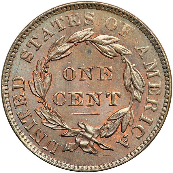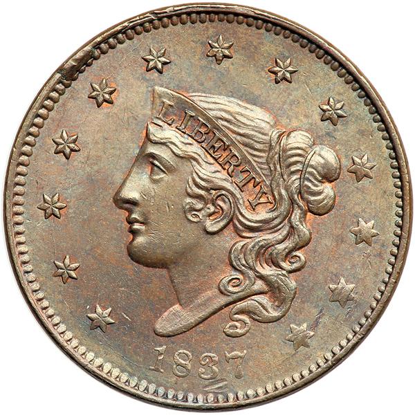1837 Coronet Head Cent. PCGS graded MS-63 Brown. Lustrous frosty light bluish steel brown with 10% of the original mint red remaining. The surfaces are satiny and very attractive. A dull nick up from the right point of star 13, a lighter one near the dentils under the 3 in the date, and a small carbon spot well above the N in ONE are the notable defects. Nicely struck E-MDS with a rim cud break at star 5. The die crack from the stem tip to the dentils has not formed. Called MS60 and tied for CC#3 in the Noyes census, his photo #33307. Bland also has this piece as MS60 and tied for CC#3. An important cent. Removed from an NGC slab graded MS64BN. The attribution and Ron Adam provenance are shown on the NGC label, which is included. Our grade is MS60+. Pop 1; 2 in 65. Only 3 graded at PCGS for the variety. DWH #2518 (PCGS # 37177) .