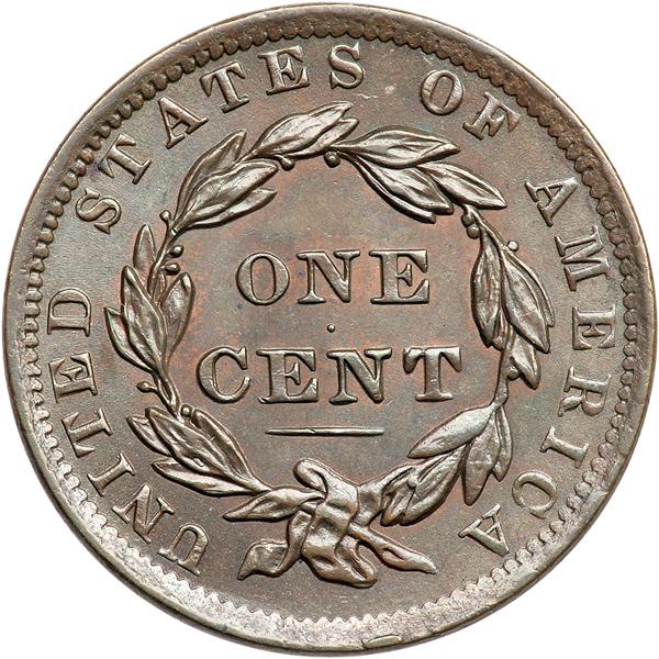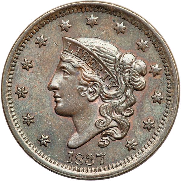 1837 Coronet Head Cent. PCGS graded MS-64 Brown. Frosty light bluish steel brown with traces of faded mint red in protected areas. The best identifying mark is a tiny nick midway between star 1 and the chin. Excellent eye appeal. E-MDS. The fields are satiny and covered with very fine die flowlines. There are no rim cud breaks on the obverse and the stray N in the leaves below NI (the so-called Accessory N) is sharp. Called MS60 and tied for CC#12 in the Noyes census, his photo #37120. Our grade is AU58. Pop 1; 1 in 65BN; 1 in 66BN. DWH #1634 (PCGS # 37135) .
