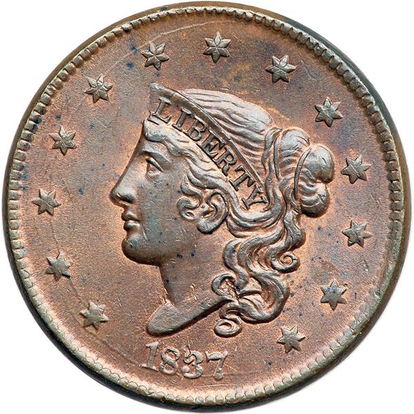 1837 Coronet Head Cent. PCGS graded MS-64 Red & Brown. Slightly faded mint red mellowing to bluish steel brown, at least a third of the original red remaining, mostly on the reverse. No spots or stains, the only notable mark a dull but rather strong rim nick over the F in OF. Otherwise very nice for the grade. MDS. The obverse fields are covered with fine die flowlines and the always-present die cracks through the date and stars 1-6 are clear. Called MS63 and tied for CC#1 honors in the Noyes census, his photo #37249. Bland says MS63 and tied for CC#2 in his census. Our grade is MS63. Pop 1; 1 in 65 RB. Only 2 graded at PCGS in Red Brown for the variety. DWH #1642 (PCGS # 37169) .