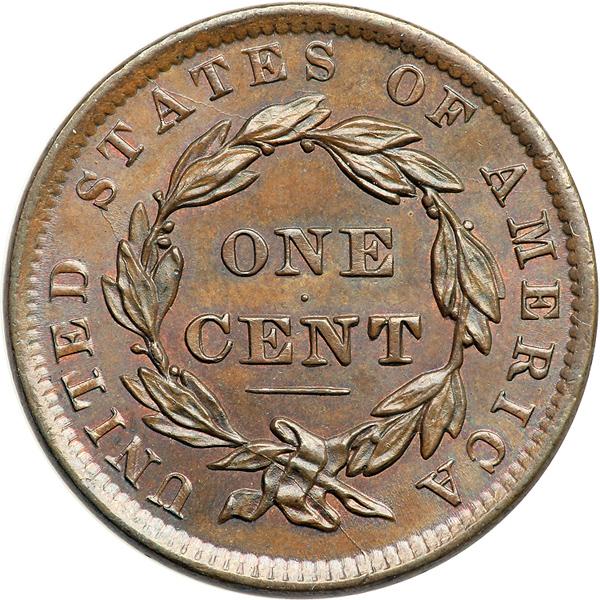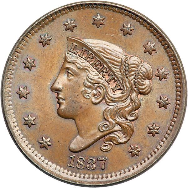 1837 Coronet Head Cent. PCGS graded MS-65 Brown. Lustrous light brown with delicate overtones of bluish steel in the fields and traces of original mint red in protected areas. The surfaces are choice, the only marks a few microscopic ticks in the field between stars 7 & 8 and another in the field above star 1. M-LDS. The dies are freshly lapped and slightly reflective with fine die polishing lines covering the fields on both sides. The vertical line just left of the upright of the1 is gone except for the lower third, which is weaker but remains clear. The small dash right of the base of the 1 is gone, as are the clashmarks on both sides, and there are no rim cuds on the reverse. Very attractive, close to MS63. Called MS61 and CC#9 in the Noyes census, his photo #37248. Our grade is MS62. Pop 1; 1 finer in MS66RB. Only 3 graded at PCGS for the variety. DWH #1636 (PCGS # 37138) .