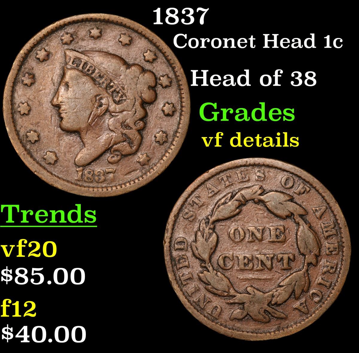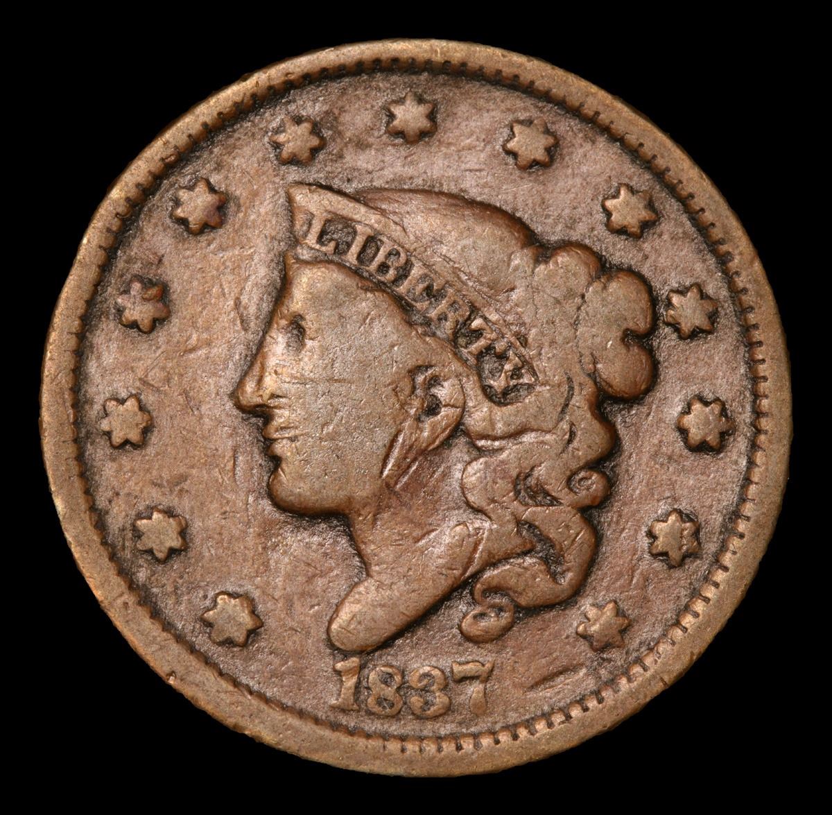 1837 Coronet Head Large Cent 1c Grades vf details.