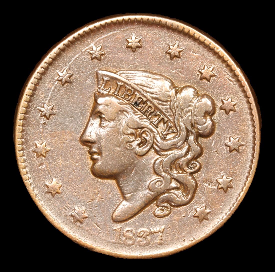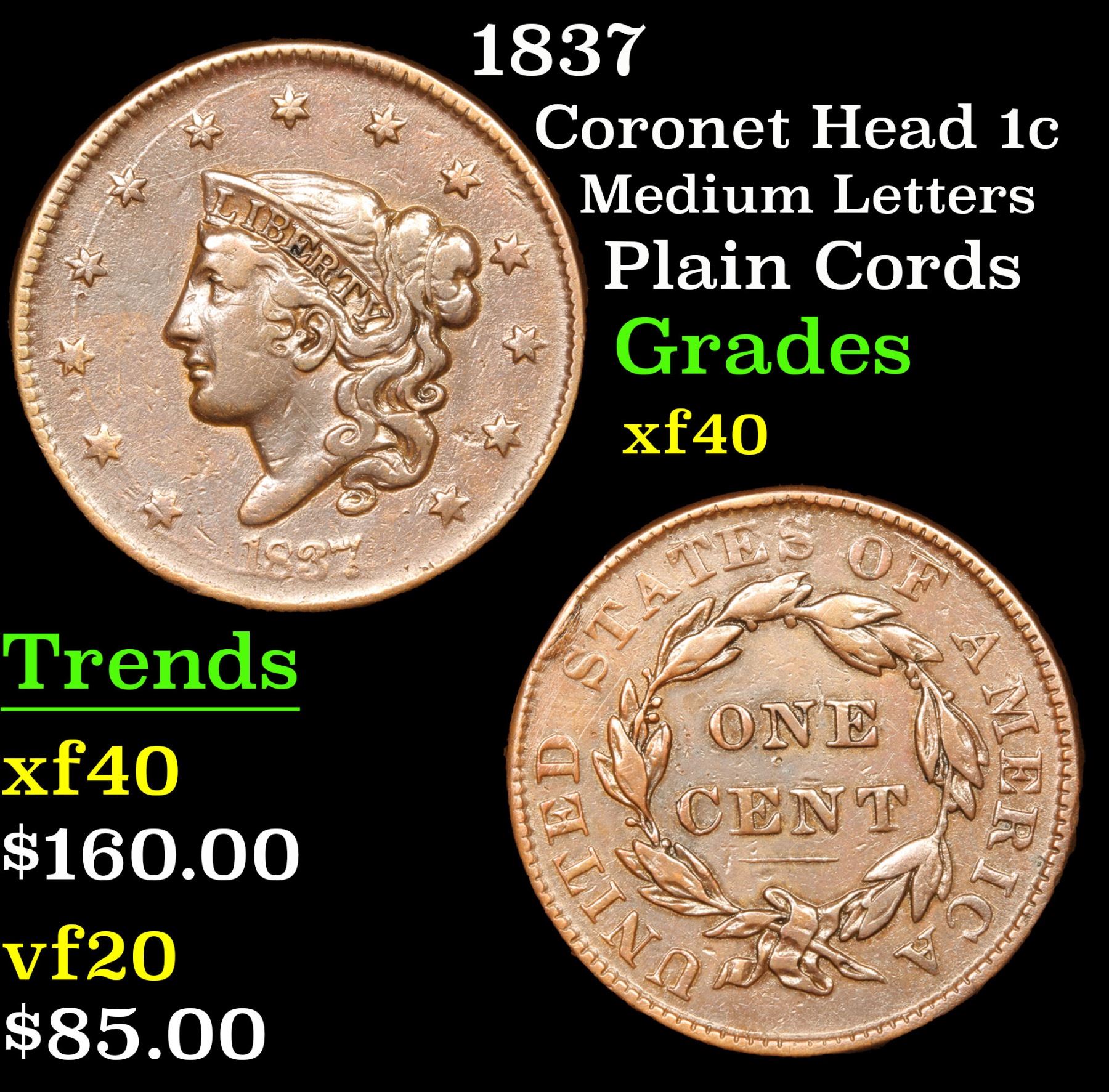 1837 Coronet Head Large Cent 1c Grades xf. Medium Letters; Plain Cords
