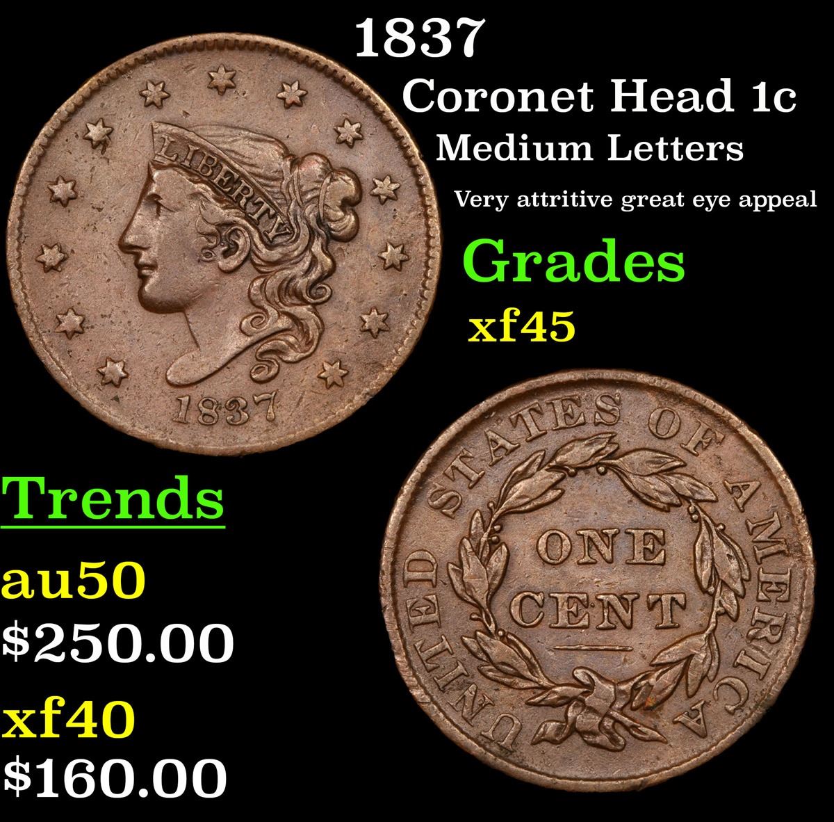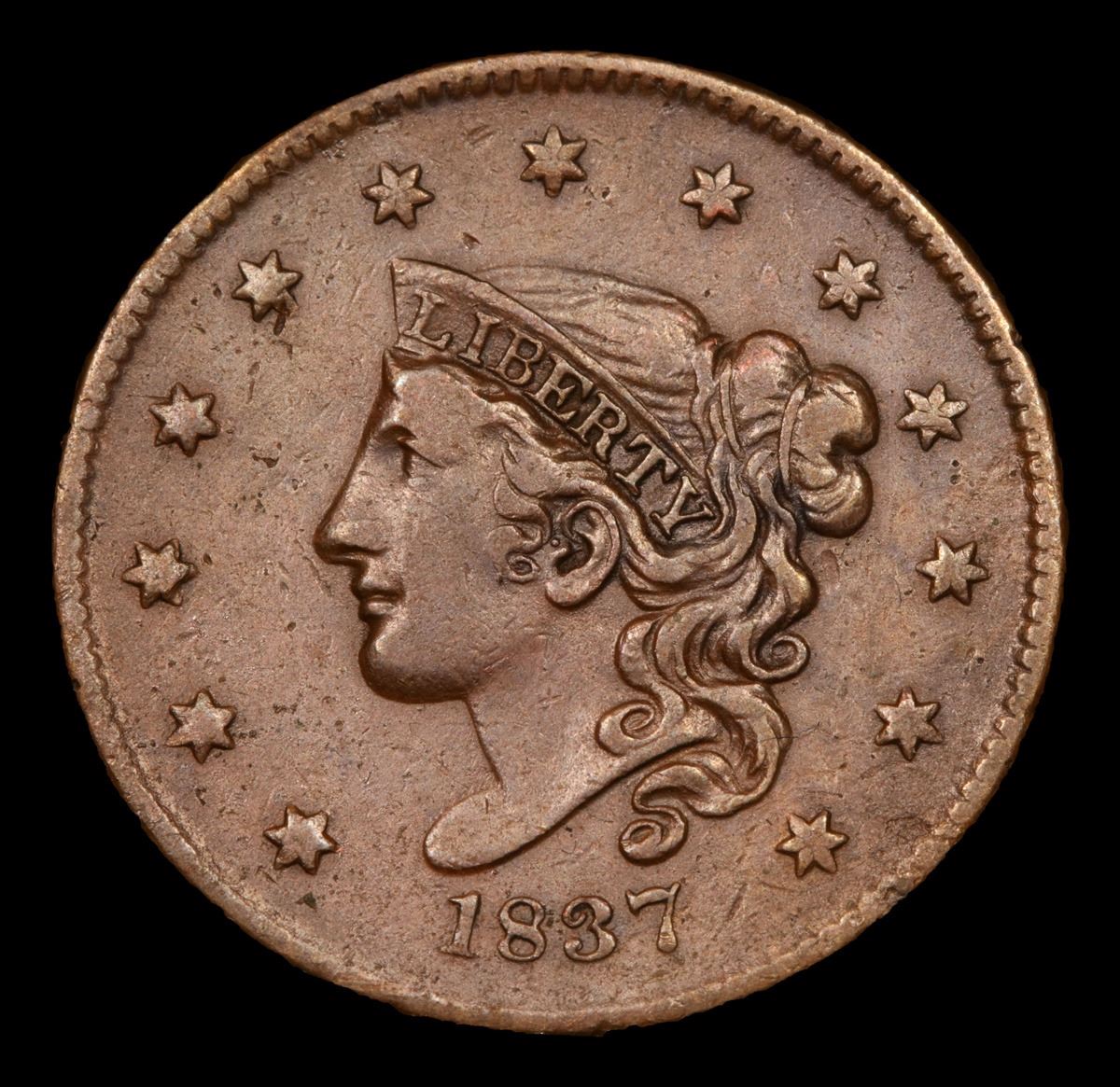 1837 Coronet Head Large Cent 1c Grades xf+.