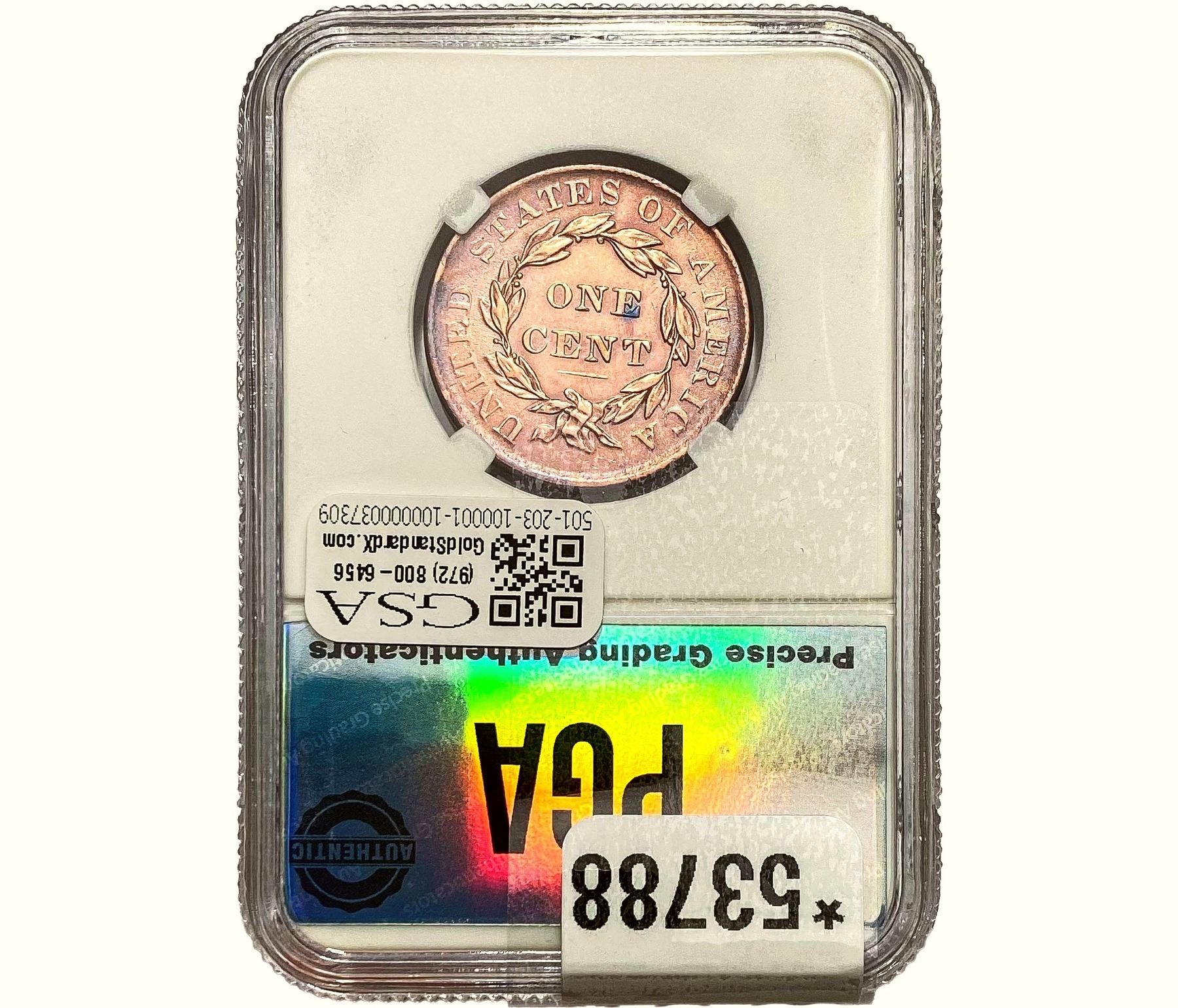 l. All non-certified coins and currency are guaranteed genuine, but are not guaranteed as to grade, since grading is a matter of opinion, an art and not a science, and therefore the description rendered by GSA or any third-party grading service may not agree with the opinion of others (including trained experts), and the same expert may not grade the same item with the same grade at two different times. GSA may, but is not obligated to, express an opinion as to non-certified numismatic items, in GSA’s opinion, or by its employees’ experience and the current interpretation of the American Numismatic Association’s standards as of the date the catalog was prepared. There is no guarantee or warranty expressed or implied that the grading opinions utilized by GSA, if any, will meet the standards of any grading service at any time in the future.