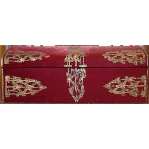 This is a stunning Victorian 1830's Cedar Humpback Chest with 1837 Harrisburg, Pa. newspaper lining attached to original Fabric. This chest was embellished during the Mid Victorian Era with Fine Bright Red Velvet and Pierced Brass Mounts to accomodate the latest fashion as a Fine Ladies Chest for storage. If you have a passion for the Victorian Era, this is a beautiful keepsake piece.