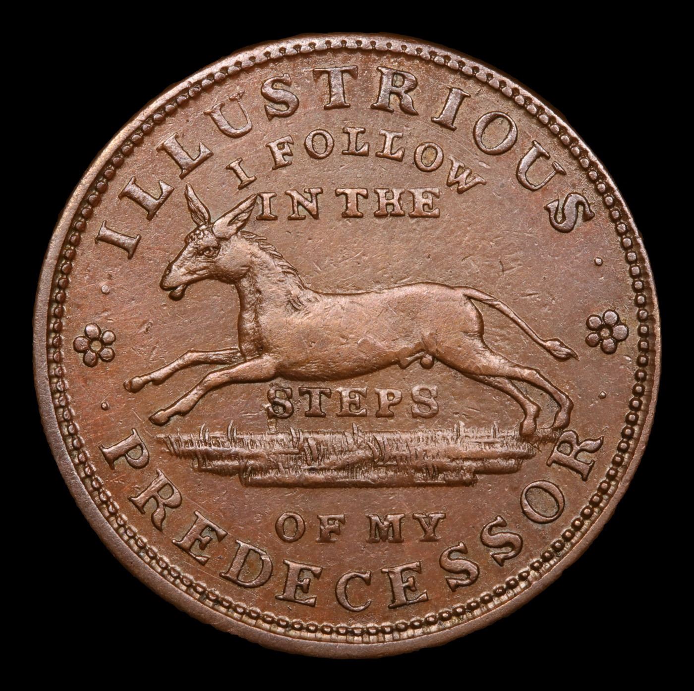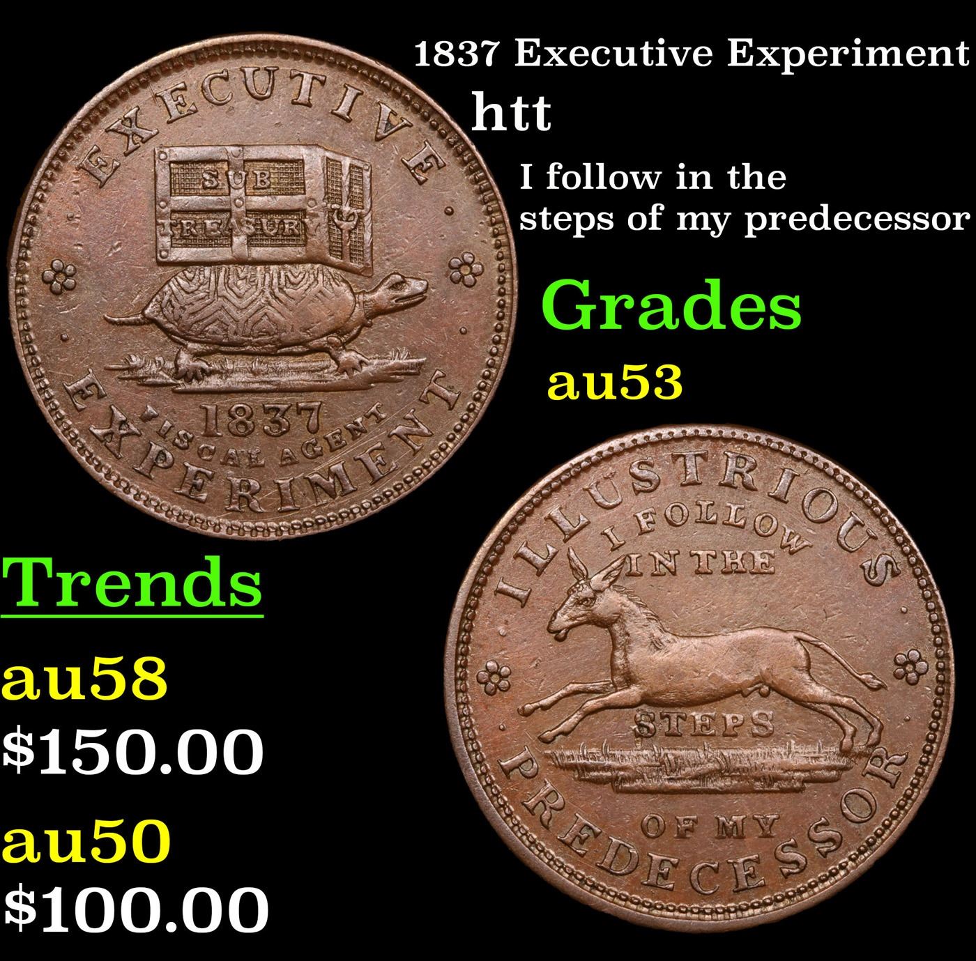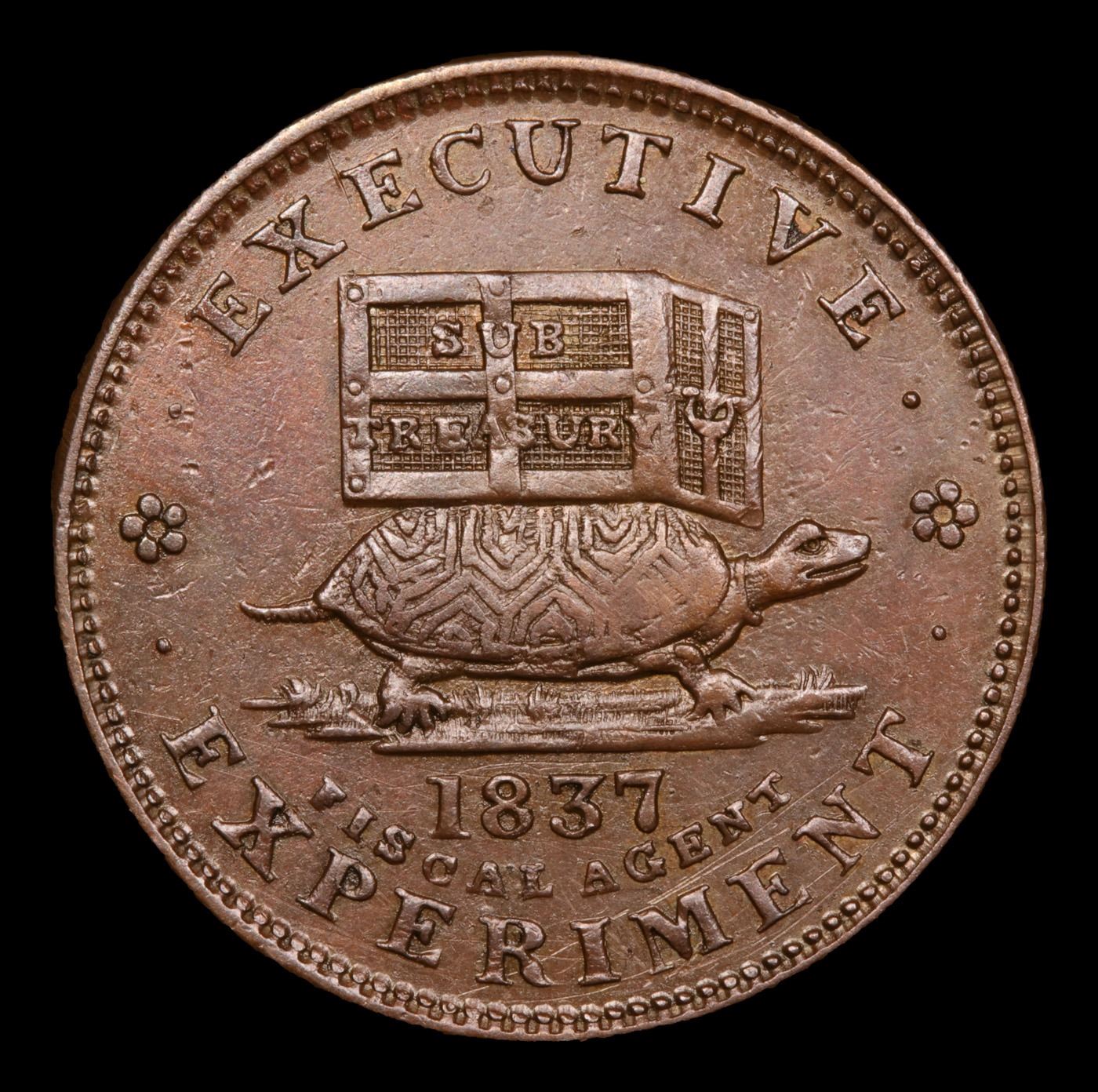 1837 Executive Experiment Hard Times Token 1c Grades Select AU. Hard Times tokens are privately issued mostly copper large cent sized tokens that were produced from 1833 to 1844. The period of economic hardship during Van Buren's presidency (the Panic of 1837) came to be known as the "Hard Times". With America in a deep recession, people began hoarding coins as a safeguard, and small change disappeared from the marketplace. In response, merchants began buying tokens from private mints so they could make change in business transactions. They were made of copper with a reverse similar to legal U.S. cents. This example is an ideological token without a head. The ‘executive experiment’ was Van Buren’s sub-treasury idea using a fiscal agent. The tortoise carrying the safe meant the democrats could never get the Bill through congress. On the reverse is a line from Van Buren’s inaugural speech when he said, “I follow in the steps of my illustrious predecessor.” Contemporary cartoons showed Van Buren behind a Jackass stepping in its hoofprints. A rare piece of American history, and a true prize for collectors. HT-32