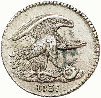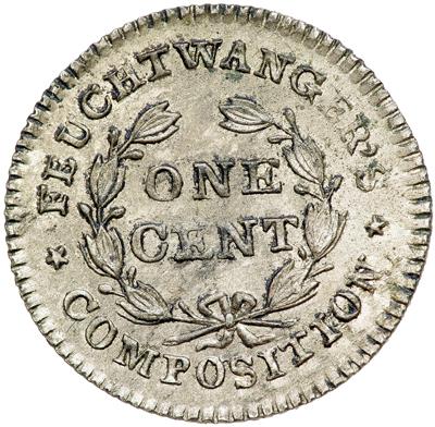 1837 Feuchtwanger Cent Hard Times Token Low-120 Rulau HT-268. AU-58. Frosty light silvery gray with mint luster remaining in the fields and protected areas. Just a hint of rub on the highest points of the eagle from mint state. The only defects are a few faint traces of very fine carbon dusted close under the eagle's neck. From the 6-I die pair.