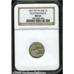 <B>1837 Feuchtwanger Cent MS63 NGC.</B></I> Low-120, HT-268, Die Variant 6-I, R.1. Dusky silver-gray and chestnut colors embrace this unabraded example. A few thin vertical charcoal planchet streaks, as made, are noted on each side.<BR><I>Ex: F.C.C. Boyd; John J. Ford, Jr. Collection, Part IV (Stack's, 6/04), lot 239.</B></I>