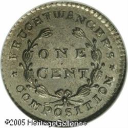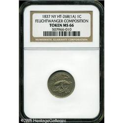 <B>1837 Feuchtwanger Cent Token MS66 NGC.</B></I> Low-120, HT-268, Breen 1-A, R.4. A scarce die variety of this popular token, which is rarely encountered in such exemplary Uncirculated condition. Light gold patina overlays the cream-gray surfaces. The high relief eagle is sharply struck. Minor strike doubling on the upper reverse legends, but flawless from a technical perspective.<BR><I>Ex: John J. Ford, Jr. Collection, Part IV (Stack's, 6/04), lot 217.</B></I> Lot:10797