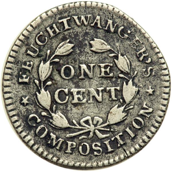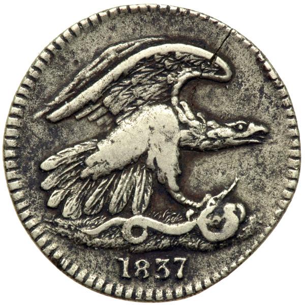 1837 Feughtwanger Cent. Sharpness of VF rough surfaces and repaired on the edge. Together with: 1830 Bust Half Sharpness of EF with scratches. Lot of 2 coins.