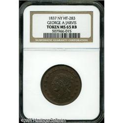 <B>1837 George A. Jarvis Hard Times Token MS65 Red and Brown NGC.</B></I> Low-122, NY HT-283, R.2. A pleasing Gem example that is mostly brown with small portions of mint red around the devices.<BR><I>Ex: John J. Ford, Jr. Collection, Part IV (Stack's, 6/04), lot 246.</B></I> Lot:10805