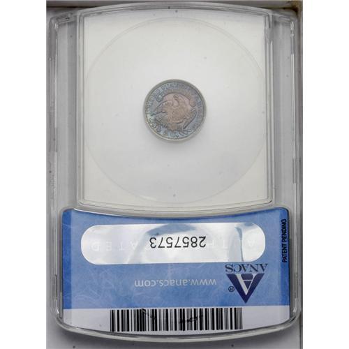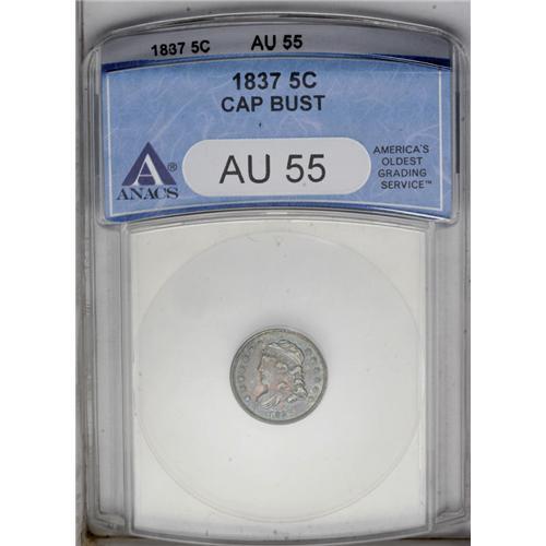 <B>1837<H10C> Large 5C AU55 ANACS.</B></I> V-3, LM-1, R.1. Easily recognized as a V-3 by the boldly repunched 7 in the date. Natural blue and rose-violet toning cloaks both sides.