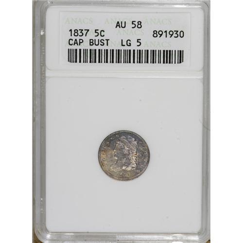<B>1837 H10C Large 5C AU58 ANACS.</B></I> NGC Census: (28/194). PCGS Population (25/61). Mintage: 871,000. Numismedia Wsl. Price for NGC/PCGS coin in AU58: $225. (#4289)<BR><BR><b>Shipping:</b> Coins & Currency (<a target="_blank" href="http://www.heritageauctions.com/common/shipping.php">view shipping information</a>)