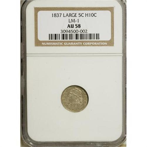 <B>1837 H10C Large 5C AU58 NGC.</B></I> LM-1. NGC Census: (16/98). PCGS Population (27/65). Mintage: 871,000. Numismedia Wsl. Price for NGC/PCGS coin in AU58: $225. (#4289)<BR><BR><B>Coin Engraver:</B> William Kneass<BR><BR><b>Shipping:</b> Coins & Currency (<a target="_blank" href="http://www.heritageauctions.com/common/shipping.php">view shipping information</a>)