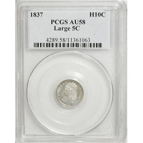 <B>1837 H10C Large 5C AU58 PCGS.</B></I> PCGS Population (26/62). NGC Census: (15/97). Mintage: 871,000. Numismedia Wsl. Price for NGC/PCGS coin in AU58: $225. (#4289)<BR><BR><B>Coin Engraver:</B> William Kneass<BR><BR><b>Shipping:</b> Coins & Currency (<a target="_blank" href="http://www.heritageauctions.com/common/shipping.php">view shipping information</a>)