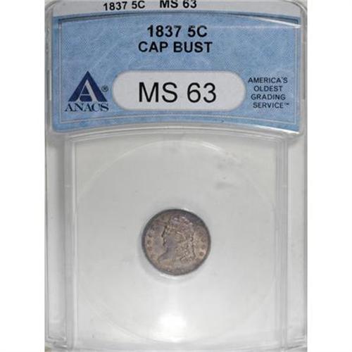<B>1837 H10C Large 5C MS63 ANACS.</B></I> V-3, LM-1, R.1. Rich russet and violet patina covers the obverse, while fainter red-brown toning is noted on the reverse. A solidly struck example with good luster and a few small marks.<BR><BR><B>Coin Engraver:</B> William Kneass<BR><BR><b>Shipping:</b> Coins & Currency (<a target="_blank" href="http://www.heritageauctions.com/common/shipping.php">view shipping information</a>)