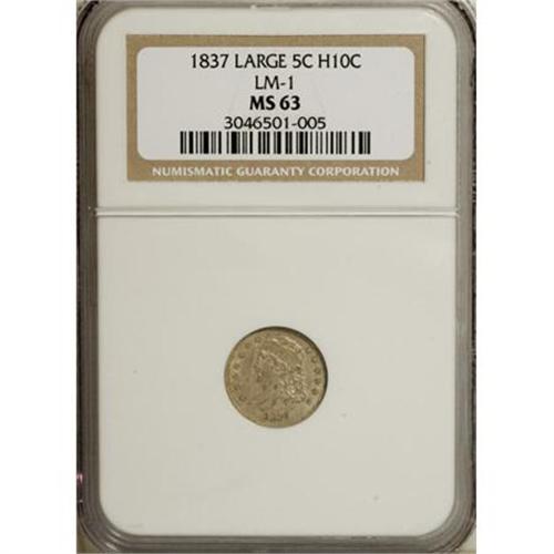 <B>1837 H10C Large 5C MS63 NGC.</B></I> LM-1. NGC Census: (24/50). PCGS Population (16/25). Mintage: 871,000. Numismedia Wsl. Price for NGC/PCGS coin in MS63: $690. (#4289)<BR><BR><B>Coin Engraver:</B> William Kneass<BR><BR><b>Shipping:</b> Coins & Currency (<a target="_blank" href="http://www.heritageauctions.com/common/shipping.php">view shipping information</a>\)
