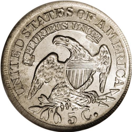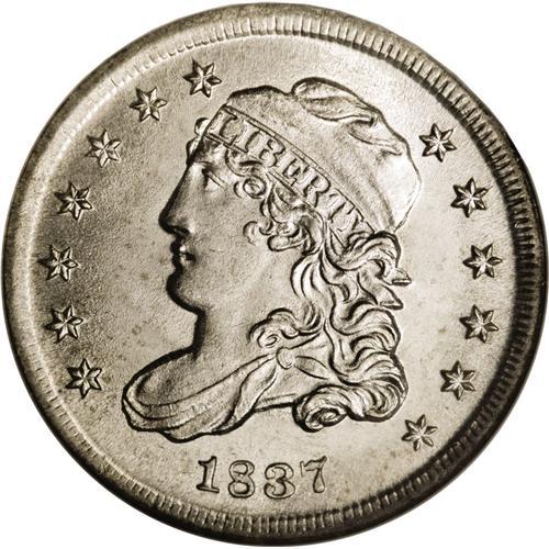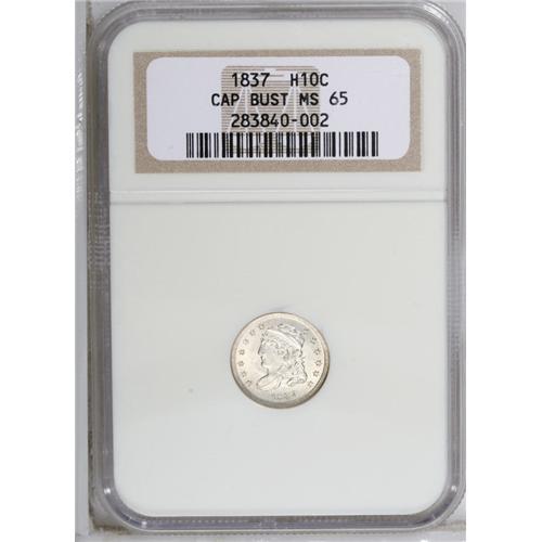 <B>1837 H10C Large 5C MS65 NGC.</B></I> V-1, LM-5, R.1. A fascinating example from the final year of the Capped Bust design. The luster is strong, and the strike is above-average. A hint of silver-gray and shell-pink patina graces the obverse, while the reverse, which is rotated approximately 50 degrees clockwise, has subtle pearl-gray and gold accents. For all Large 5 varieties, Census: 12 in 65, 6 finer (10/06).<BR><I>From The Stone 1837 Collection.</B></I><BR><BR><b>Shipping:</b> Coin/Currency (<a target="_blank" href="http://www.heritageauctions.com/common/shipping.php">view shipping information</a>)