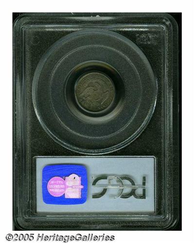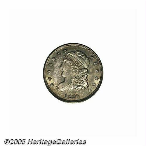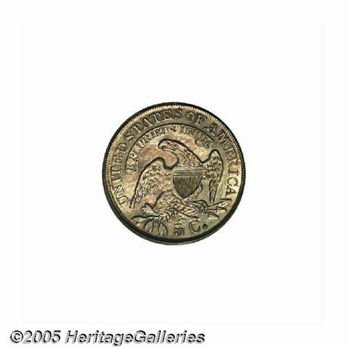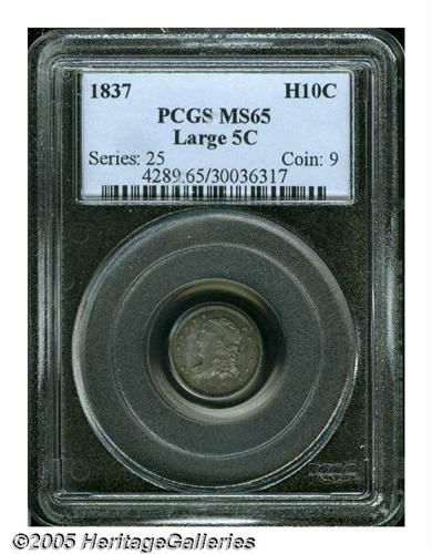 <B>1837<H10C> Large 5C MS65 PCGS.</B></I> V-1, LM-5, R.1. The first A in AMERICA is widely repunched on this more available variety. The eagle's left (facing) shoulder is not fully struck, but this attractive example has vivid sea-green and honey-gold colors. About 30 degrees of clockwise die rotation is noted.