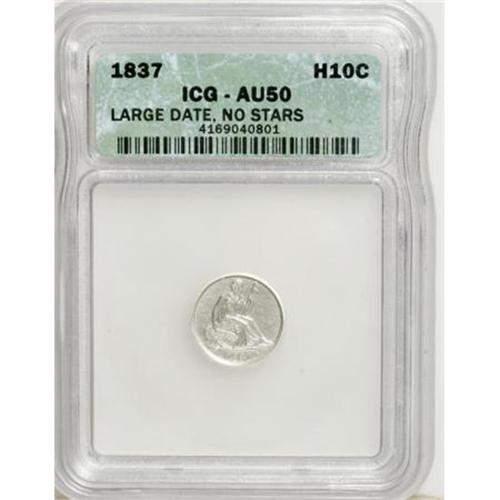 <B>1837 H10C Large Date (Curl Top 1) AU50 ICG.</B></I> NGC Census: (12/811). PCGS Population (30/604). Mintage: 1,405,000. Numismedia Wsl. Price for NGC/PCGS coin in AU50: $292. (#4311)<BR><BR><B>Coin Engraver:</B> Christian Gobrecht<BR><BR><b>Shipping:</b> Coins & Currency (<a target="_blank" href="http://www.heritageauctions.com/common/shipping.php">view shipping information</a>)