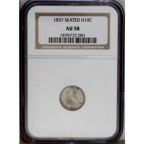 <B>1837<H10C> Large Date (Curl Top 1) AU58 NGC.</B></I> Rich tan and ocean-blue toning embraces this well struck and generally lustrous No Stars type coin. Wear is not obvious, although the fields display light handling marks from brief circulation. <BR><BR><B>Important notice:</B> Heritage usually auctions material at the rate of 200-250 lots per hour. On some occasions eBay Live bid software or the Internet may not be able to keep up with the pace of the auction. We recommend placing a realistic absentee bid now as insurance to avoid disappointment. Occasionally the auctioneer may eliminate or reject an eBay Live bid, and the auctioneer may also reopen a lot after the close of the eBay live bidding (usually because we missed an audience bid), and may reject your bid even if it shows you as the winning bidder. By bidding via eBay Live, you agree that Heritage may award the lot to another bidder at its sole discretion under the circumstances described above or any other reasonable circumstances. Since eBay bids are not shown to us until we open the lot on the floor, we treat those bids just like floor bids. In most cases the floor responds before the eBay bid is presented to us, due to Internet lag time, so for consistency we have made it a policy that floor bids are always considered first over tie eBay live bids. Also please note that all Heritage lots purchased through eBay Live carry a 20% Buyer's Premium. Please make sure you read the Terms and Conditions before you bid. This lot is being auctioned in conjunction with a live floor auction by Heritage Galleries & Auctioneers. All final auction and invoice information will be supplied by Heritage Galleries & Auctioneers, and all other information should be considered preliminary. Lot:1879 <BR><BR><B>Winning Notification and Billing:</B> After the FINAL session in this auction is complete, Heritage will send e-mail and snail mail invoices. This process normally takes several days. All final auction and invoice information will be supplied by Heritage Galleries & Auctioneers, and all other information should be considered preliminary. <BR><BR>This auction will be conducted on a live auction floor and over the Internet through eBay Live. If you choose to place an absentee bid, please take a moment to <font color='#0000ff'><u><a href='http://pages.ebay.com/liveauctions/help/before/laabsentee.html'>learn how eBay Live absentee bidding works</a></u></font><font color='#000000'>