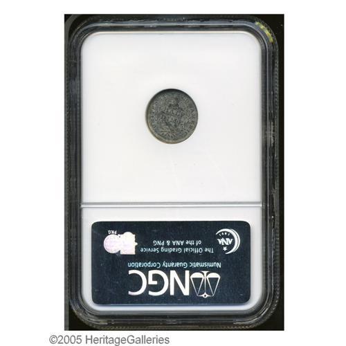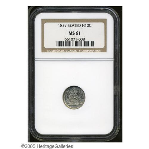<B>1837<H10C> Large Date (Curl Top 1) MS61 NGC.</B></I> Slanted 1 and script 8 in date. Dappled gray toning runs over each side. The design elements are adequately impressed, and just a few minute marks are scattered about.