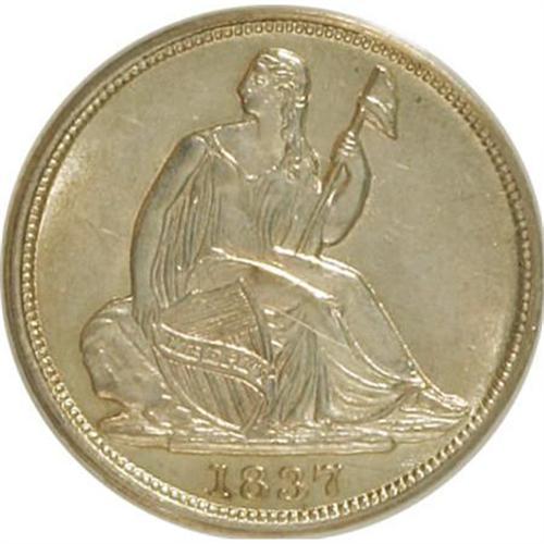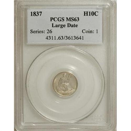 <B>1837 H10C Large Date (Curl Top 1) MS63 PCGS.</B></I> PCGS Population (128/230). NGC Census: (117/436). Mintage: 1,405,000. Numismedia Wsl. Price for NGC/PCGS coin in MS63: $725. (#4311)<BR><BR><B>Coin Engraver:</B> Christian Gobrecht<BR><BR><b>Shipping:</b> Coins & Currency (<a target="_blank" href="http://www.heritageauctions.com/common/shipping.php">view shipping information</a>)
