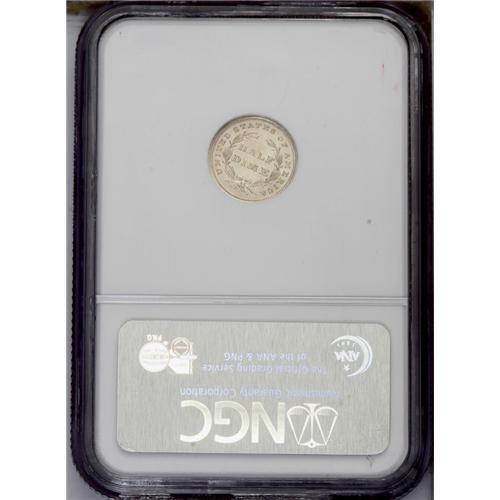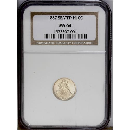 <B>1837<H10C> Large Date (Curl Top 1) MS64 NGC.</B></I> Brilliant and sharply struck with satiny silver luster on both sides. Light abrasions limit the grade of this near-Gem example. The reverse is rotated a few degrees clockwise. <BR><BR><B>Important notice:</B> Heritage usually auctions material at the rate of 200-250 lots per hour. On some occasions eBay Live bid software or the Internet may not be able to keep up with the pace of the auction. We recommend placing a realistic absentee bid now as insurance to avoid disappointment. Occasionally the auctioneer may eliminate or reject an eBay Live bid, and the auctioneer may also reopen a lot after the close of the eBay live bidding (usually because we missed an audience bid), and may reject your bid even if it shows you as the winning bidder. By bidding via eBay Live, you agree that Heritage may award the lot to another bidder at its sole discretion under the circumstances described above or any other reasonable circumstances. Since eBay bids are not shown to us until we open the lot on the floor, we treat those bids just like floor bids. In most cases the floor responds before the eBay bid is presented to us, due to Internet lag time, so for consistency we have made it a policy that floor bids are always considered first over tie eBay live bids. Also please note that all Heritage lots purchased through eBay Live carry a 20% Buyer's Premium. Please make sure you read the Terms and Conditions before you bid. This lot is being auctioned in conjunction with a live floor auction by Heritage Galleries & Auctioneers. All final auction and invoice information will be supplied by Heritage Galleries & Auctioneers, and all other information should be considered preliminary. Lot:1880 <BR><BR><B>Winning Notification and Billing:</B> After the FINAL session in this auction is complete, Heritage will send e-mail and snail mail invoices. This process normally takes several days. All final auction and invoice information will be supplied by Heritage Galleries & Auctioneers, and all other information should be considered preliminary. <BR><BR>This auction will be conducted on a live auction floor and over the Internet through eBay Live. If you choose to place an absentee bid, please take a moment to <font color='#0000ff'><u><a href='http://pages.ebay.com/liveauctions/help/before/laabsentee.html'>learn how eBay Live absentee bidding works</a></u></font><font color='#000000'>