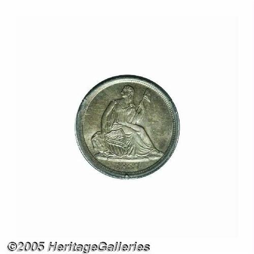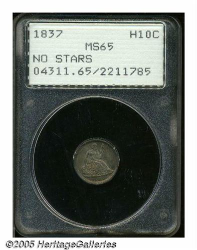 <B>1837<H10C> Large Date (Curl Top 1) MS65 PCGS.</B></I> Apricot, sea-green, and rose colors endow this satiny and attractive Gem. Crisply struck except for the left side obverse denticles, and the originally toned surfaces are exquisitely preserved. The No Stars type is an initial and short-lived entrant in the Seated Liberty series. Encapsulated in a first generation PCGS holder.