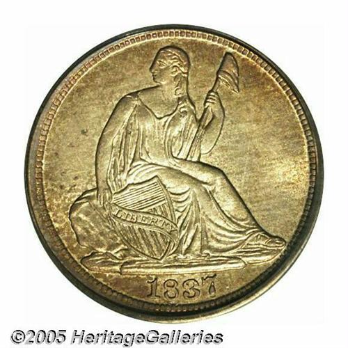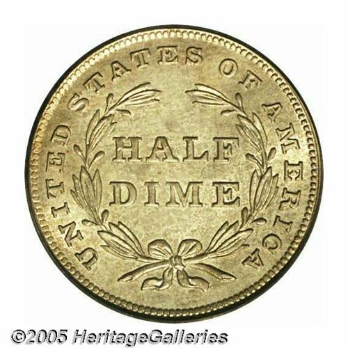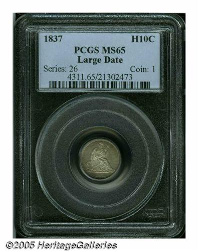 <B>1837<H10C> Large Date (Curl Top 1) MS65 PCGS.</B></I> This introductory year Half Dime has undisturbed lustrous surfaces and original medium honey and pearl-gray patina. The design elements are well struck throughout. An early die state, the repunching on the base of the digits in the date is clear. The No Stars type was struck at Philadelphia only in 1837, and Gems are coveted by type collectors in addition to specialists of the Liberty Seated series. Traditionally called the Large Date variety, the logotype is quite different from its Small Date counterpart although no size difference is readily apparent. Population: 62 in 65, 28 finer (6/05).<BR><I>From The Melrose Bay Collection.</B></I>
