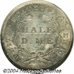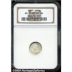 <B>1837<H10C> Large Date (Curl Top 1) MS66 NGC.</B></I> A highly lustrous premium Gem, this introductory year Half Dime has undisturbed surfaces and original medium honey and pearl-gray patina. Well struck except for the left side denticles. An early die state, the repunching on the base of the 8 and 7 is clear. The No Stars type was struck at Philadelphia only in 1837, and Gems are coveted by type collectors in addition to specialists of the Liberty Seated series. Traditionally called the Large Date variety, the logotype is quite different from its Small Date counterpart although no size difference is readily apparent. <BR><BR><B>Important notice:</B> Heritage usually auctions material at the rate of 200-250 lots per hour. On some occasions eBay Live bid software or the Internet may not be able to keep up with the pace of the auction. We recommend placing a realistic absentee bid now as insurance to avoid disappointment. Occasionally the auctioneer may eliminate or reject an eBay Live bid, and the auctioneer may also reopen a lot after the close of the eBay live bidding (usually because we missed an audience bid), and may reject your bid even if it shows you as the winning bidder. By bidding via eBay Live, you agree that Heritage may award the lot to another bidder at its sole discretion under the circumstances described above or any other reasonable circumstances. Since eBay bids are not shown to us until we open the lot on the floor, we treat those bids just like floor bids. In most cases the floor responds before the eBay bid is presented to us, due to Internet lag time, so for consistency we have made it a policy that floor bids are always considered first over tie eBay live bids. Also please note that all Heritage lots purchased through eBay Live carry a 20% Buyer's Premium. Please make sure you read the Terms and Conditions before you bid.