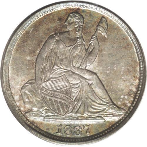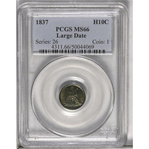 <B>1837<H10C> Large Date (Curl Top 1) MS66 PCGS.</B></I> Close examination reveals the remnants of the initial punchings of the bottom of the digits of the date. The surfaces themselves are extraordinarily clean with a loupe required to locate any post-striking impairments. As with most Uncirculated examples of this date, the mint luster is exceptionally bright. The obverse is covered in sea-green and rose patina, while the reverse displays a nearly uniform layer of thalo blue. Population: 30 in 66, 3 finer (6/06).<BR><I>From The Belle Glade Collection.</B></I>