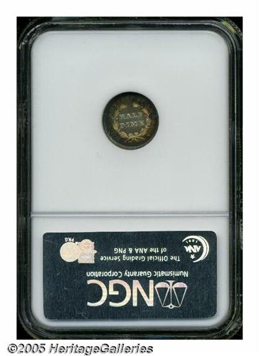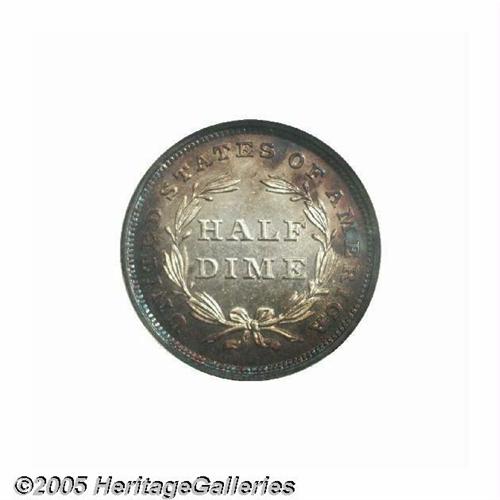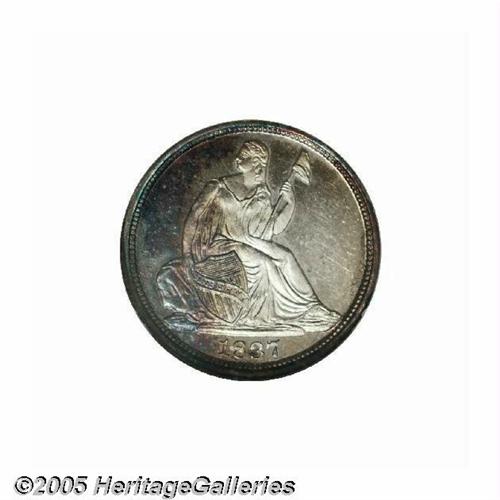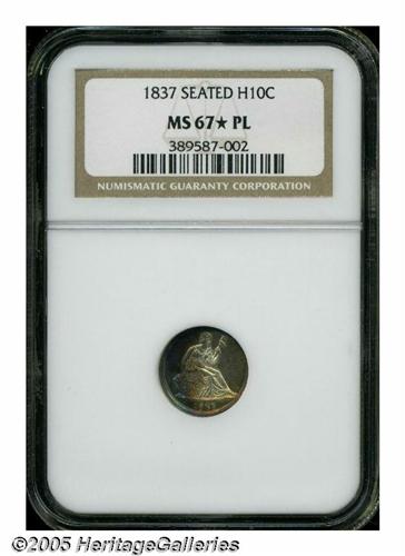 <B>1837<H10C> Large Date (Curl Top 1) MS67 <S Prooflike NGC.</B></I> A middle die state, some of the repunching on the date is still evident below all four digits. A high mintage (for the era--1.4 million pieces were produced), first-year issue, the 1837 seems to have been saved in significant numbers. As such, neither circulated nor Mint State type collectors should have any difficulty locating a suitable example in today's market. Precious few survivors, however, are close enough to perfection to grade finer than MS66 at NGC or PCGS. This is just such a coin, and the sharply impressed features are silent on the subject of grade-limiting abrasions. As impressive as these features are, they are not the first that greet the viewer. That distinction belongs to a rich endowment of purple-copper and cobalt-blue toning at the left portion of the obverse. The reverse exhibits a ring of deep copper-red color with blue accents, and the surfaces are deeply reflective indicating an early strike. This is a coin that no high quality type set should be without. The only coin of the date to receive a Prooflike designation from NGC, and surpassed in grade by only two pieces, only one of which shares the <S designation with this remarkable coin (6/05).
