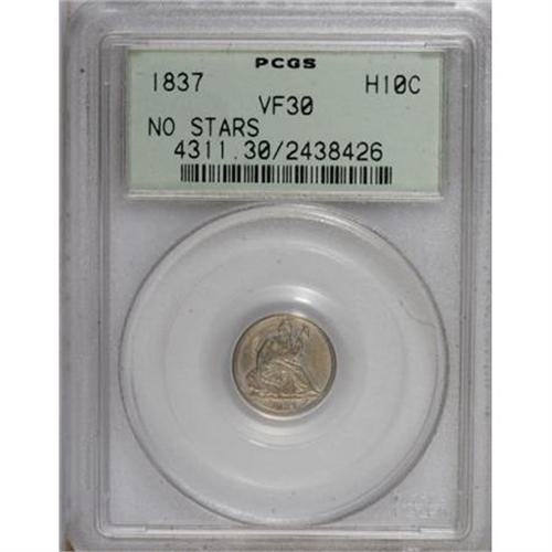 <B>1837 H10C Large Date (Curl Top 1) VF30 PCGS.</B></I> PCGS Population (6/672). NGC Census: (2/858). Mintage: 1,405,000. Numismedia Wsl. Price for NGC/PCGS coin in VF30: $124. (#4311)<BR><BR><B>Coin Engraver:</B> Christian Gobrecht<BR><BR><b>Shipping:</b> Coins & Currency (<a target="_blank" href="http://www.heritageauctions.com/common/shipping.php">view shipping information</a>)