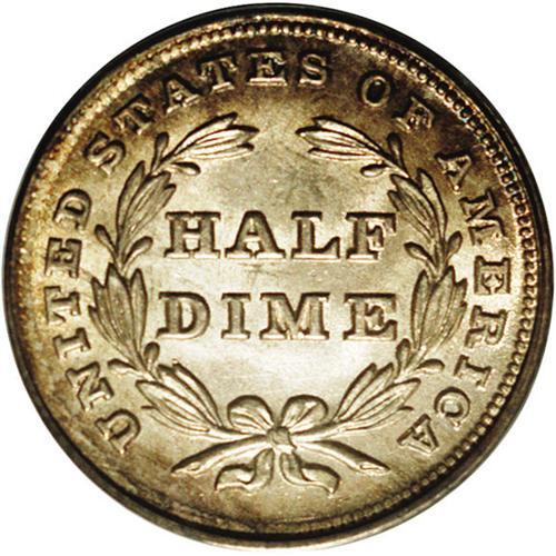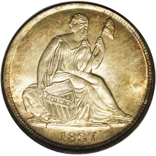 <B>1837<H10C> Large Date (Curl Top 1) MS65 PCGS.</B></I> V-2. Two date varieties are known. The Large Date variety has a tall, curved peak to the digit 1 and the Small Date variety has a flat top to the 1. This example is from a late die state with a broken obverse die, cracked from the border at 8 o'clock to the shield, then jogging upward along the pole and through the cap to the border above. Other minor obverse cracks are also present. Frosty silver surfaces are enhanced by lovely golden toning on both sides, increasing in intensity near the borders. Although both borders show some weakness, the central obverse and reverse details are boldly defined.