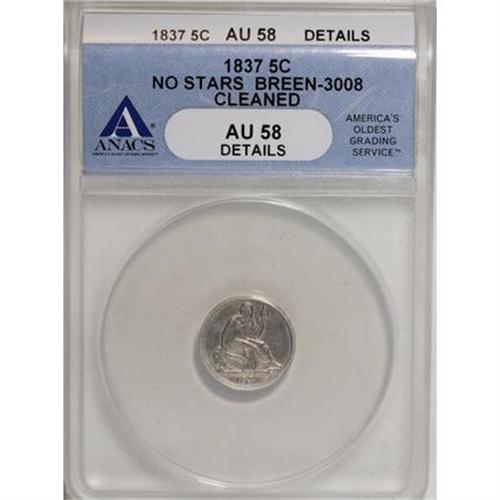 <B>1837 H10C No Stars Large Date (Curl Top 1)--Cleaned--ANACS AU58 Details.</B></I> Breen-3008. NGC Census: (97/691). PCGS Population (72/464). Mintage: 1,405,000. Numismedia Wsl. Price for NGC/PCGS coin in AU58: $400. (#4311)<BR><I>From The Al Blythe Collection of Half Dimes.</B></I><BR><BR><B>Coin Engraver:</B> Christian Gobrecht<BR><BR><b>Shipping:</b> Coins & Currency (<a target="_blank" href="http://www.heritageauctions.com/common/shipping.php">view shipping information</a>)