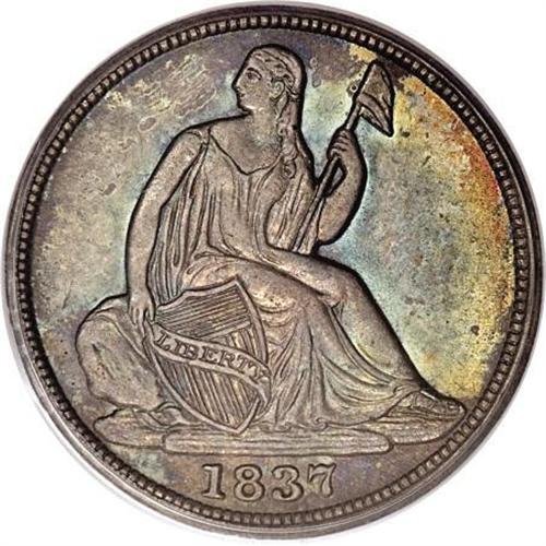 <B>1837 H10C No Stars, Small Date (Flat Top 1) MS65 PCGS. CAC.</B></I> Glowing luster radiates from surfaces covered with a mix of light to medium-intensity cobalt-blue, violet-gray, reddish-gold, and yellow-gold patina. The design elements are sharply impressed, as is typical for the issue. Well preserved, with just a few grade-consistent marks. Population: 10 in 65, 11 finer (3/08).<BR><I>From The Good Humor Collection.</B></I><BR><BR><B>Coin Engraver:</B> Christian Gobrecht<BR><BR><b>Shipping:</b> Coins & Currency (<a target="_blank" href="http://www.heritageauctions.com/common/shipping.php">view shipping information</a>)