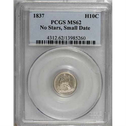 <B>1837 H10C Small Date (Flat Top 1) MS62 PCGS.</B></I> The obverse of this early Seated half dime shows minimal patina, while the reverse displays hints of ice-blue and pink. Well-defined on both sides with none of the distracting marks one would expect for the grade.<BR><BR><B>Coin Engraver:</B> Christian Gobrecht<BR><BR><b>Shipping:</b> Coins & Currency (<a target="_blank" href="http://www.heritageauctions.com/common/shipping.php">view shipping information</a>)